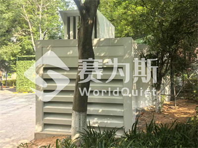 2.隔声罩含吸隔声模块、隔声检修门、进风百叶消声器、排风片式消声器(带轴流风机)。正面设进风消声器与检修门,散热口装消声风道及排风装置,出风口避开居民楼。