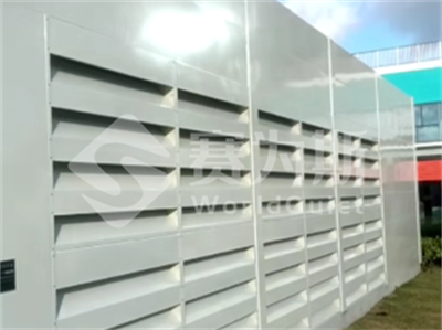 为空调机组设计整体通风隔声罩。隔声罩北侧设一扇检修门便于设备检修,预留内部检修通道。顶部排风,定制出风消声器并增导流段,排风面积合理扩大;东南侧进风,设防雨百叶与消声器,总进风面积满足需求,以此实现降噪。