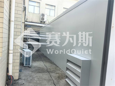 利用现场原有屏障,设计安装热泵机组通风隔声房,隔声房由钢结构框架、吸隔声主材、排风消声器组成。设备隔声房敞开进风面,同时设置补风消声通道。